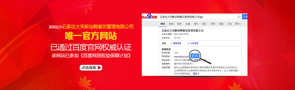 隨著產(chǎn)品的升級,大宋醉仙鴨總部的經(jīng)營理念不斷提升,經(jīng)營的規(guī)模不斷擴(kuò)大,之后又陸續(xù)開了多家直營店。2014年3月,石家莊大宋醉仙鴨餐飲管理有限公司正式成立,之后在國家商標(biāo)總局申請注冊“大宋醉仙鴨”商標(biāo)。